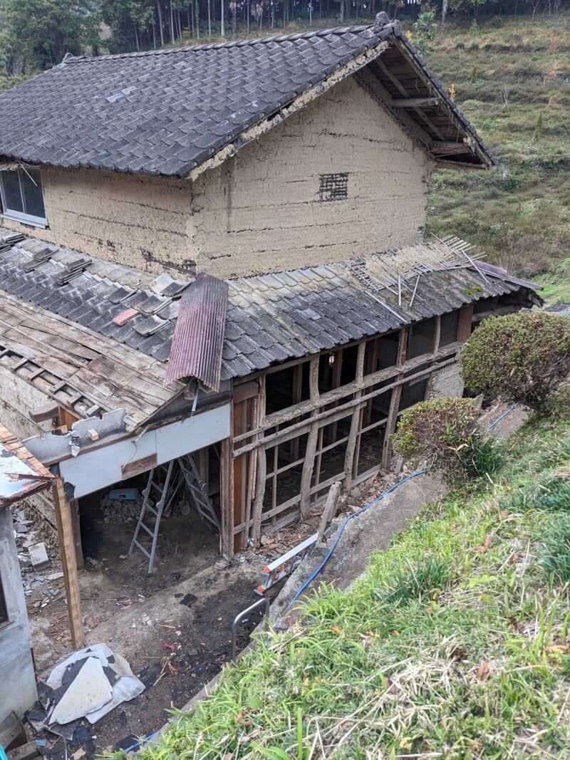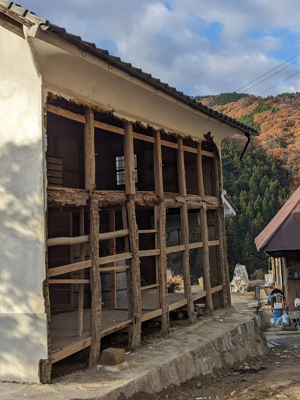 損傷が大きかった外壁は全面撤去した後、外側に木組みを設置して新たな壁を造作。